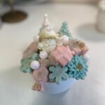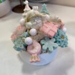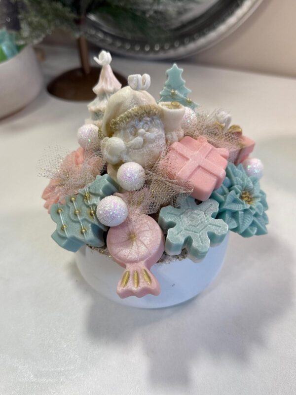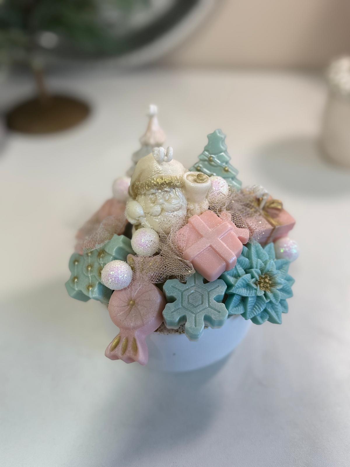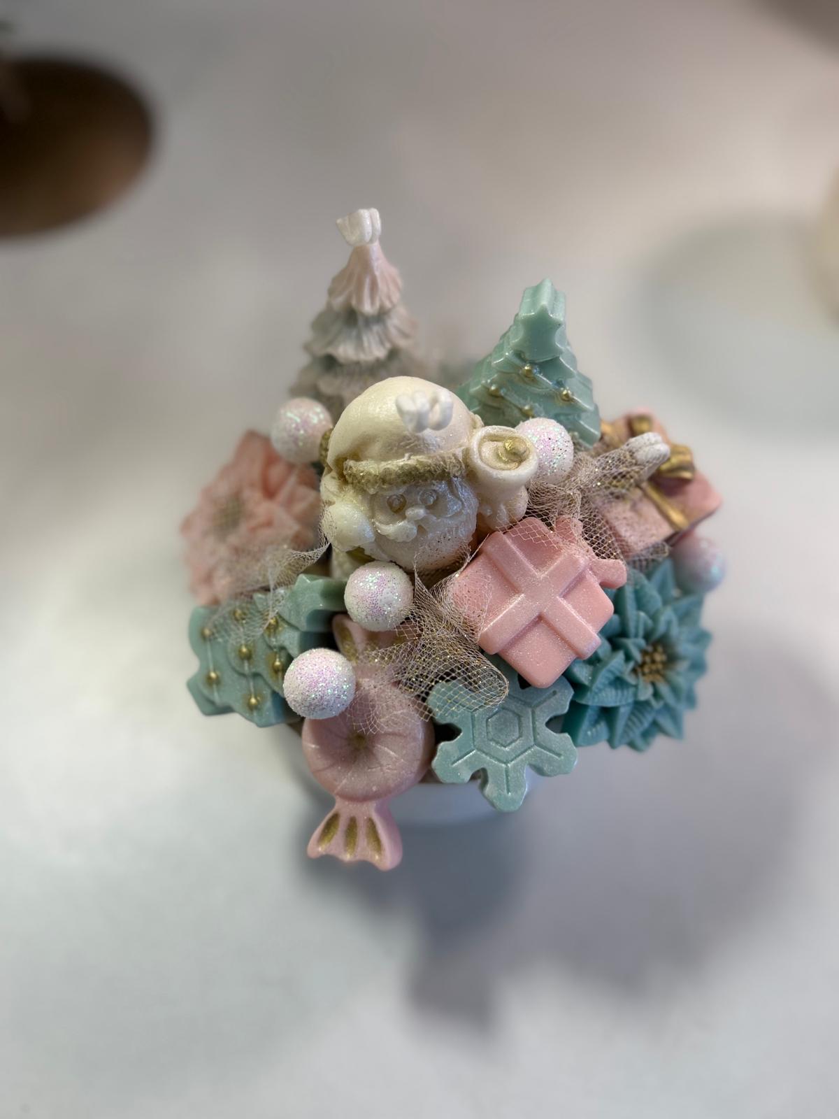 handmade pastel Christmas candle featuring Santa ,snowflakes, gifts ,festive and perfect for holiday decor